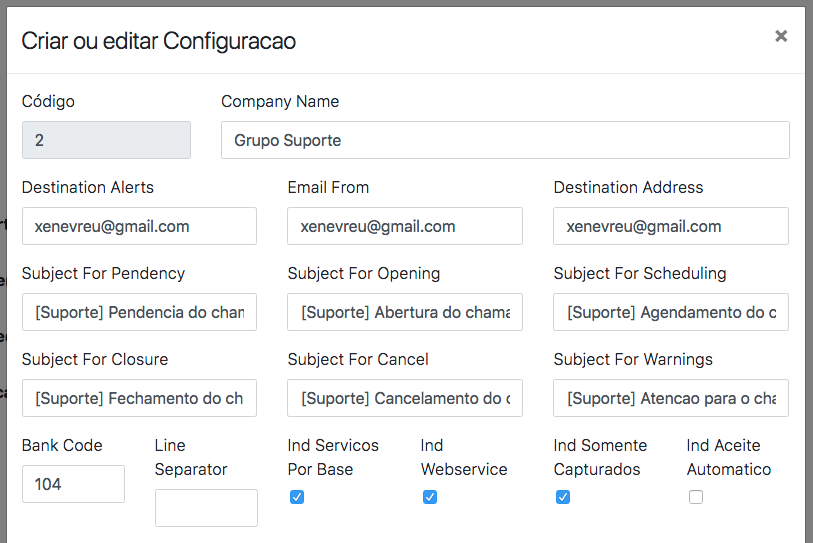 Parametrizações diversas. É possível configurar rotas de email e parâmetros de regras de negócio como Abertura automática, dentre outros.