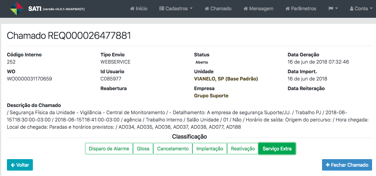 Apresenta as informações do chamado, com a descrição do texto informado pelo usuário da Caixa Federal. Além disto, apresenta informações como Unidade e Base de atendimento, necessários para a delegação do atendimento.