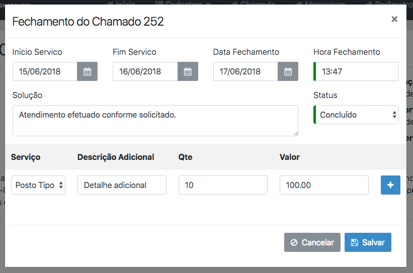 Informações de fechamento do chamad que serão enviadas para a CEF. É possível relacionar serviços com preços por contrato, além de informar pendências antes do fechamento efetivo do chamado.
