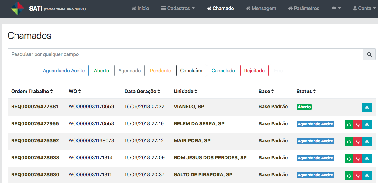 Principal tela do sistema, onde o operador irá receber as atualizações dos chamados, aceitar, agendar e concluir chamados. Esta tela possibilita diversas pesquisas, onde o usuário pode, em poucos cliques, encontrar o que precisa.